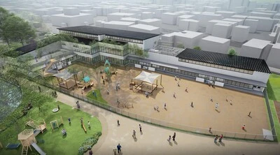 | 駐車場 | 保護者の送迎時に前面道路に渋滞が生じないよう、南東側に40台の駐車スペースを設けています。また、保育ステーション事業に対応できるようバス用のスペースを設けています。 |